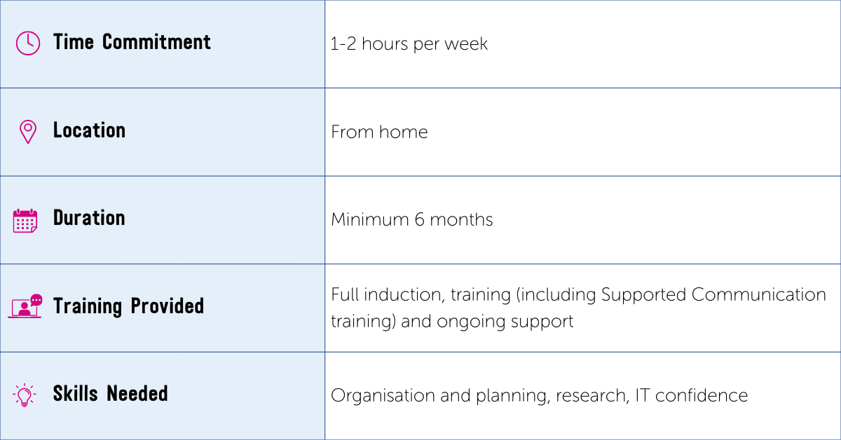 Join our amazing team of Virtual Communication Support Volunteers, who support people who have one or more of our conditions via Microsoft Teams or Zoom to develop confidence, enabling them to fully engage with their community.